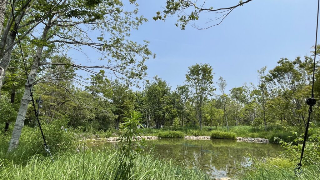 直径約20mの池を囲むように、万博記念公園や大阪府内の公園等から、将来間伐予定の樹木など約1,500本が移植されています。