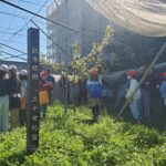 松戸市の観光梨園の農家のみなさんの指導の下、ぼんてんを持って花粉つけの授業が行われました