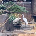 ふと、外を見ると、松と亀の横に、ダイサギ(たぶん)がただずんでいました。