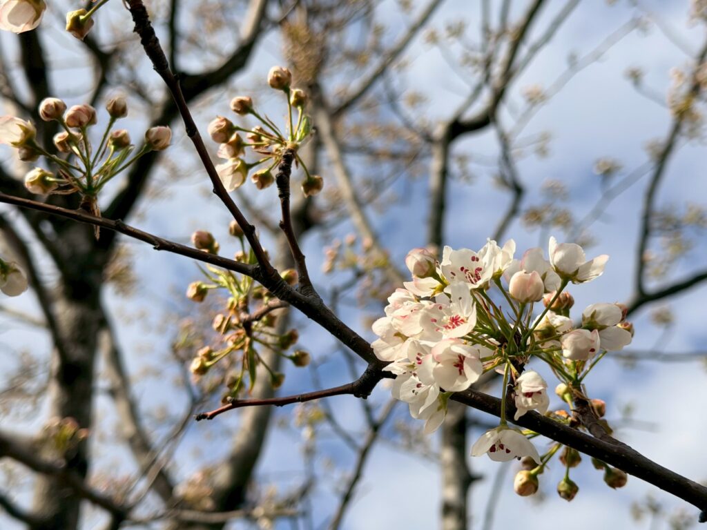 本社のマメナシの花が、ポツリ ポツリと咲いてきました